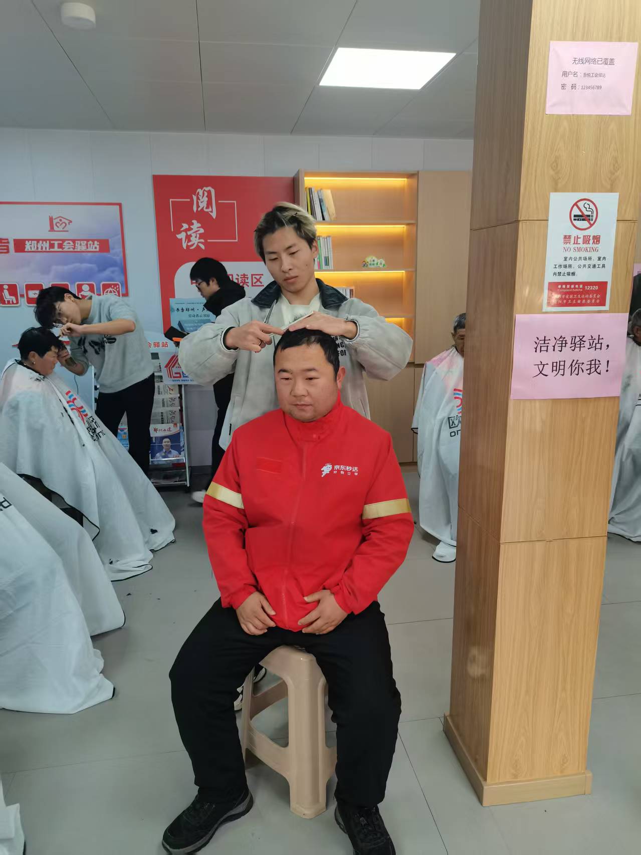 本次活动是总工会依托工会驿站前沿阵地,精准服务新就业形态劳动者的生动实践。在工会人员的组织下,活动现场井然有序,驿站内暖意融融。志愿者理发师技艺娴熟,根据大家的职业特点,修剪出清爽利落的发型。